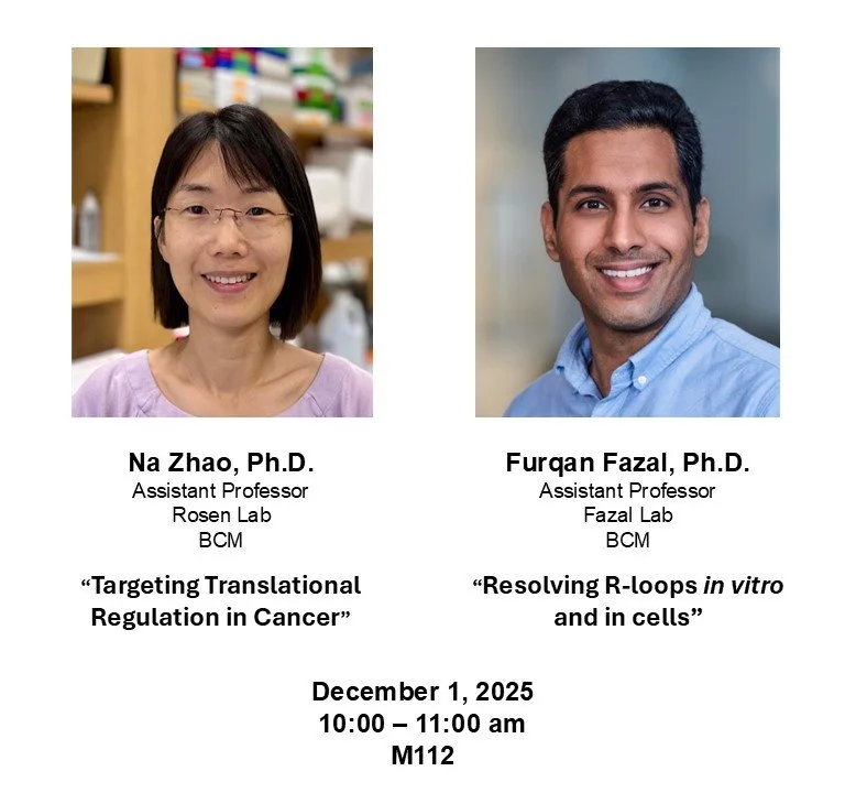 Our next RNA Group will be December 1st, Na Zhao, Ph.D., Assistant Professor from Rosen Lab (BCM) and Furqan Fazal, Ph.D., Assistant Professor from Fazal Lab (BCM) will present their work. Hope to see you there!